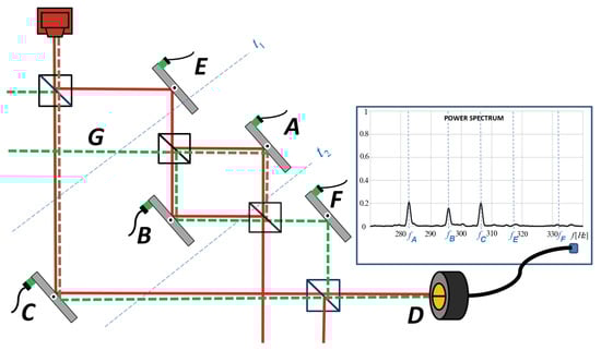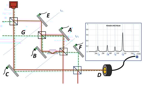 This is no longer the case when the Dove prism is introduced (Figure 2). For mirror B, there is a difference: mode is unaffected by the presence of the prism, while mode flips the sign. The shift on the detector changes its direction. This change, however, is not observable in the experiment, since the frequency spectrum is sensitive only to the size of the signal. The observable difference appears for mirror E. There are two paths from E to the output port D, one passing through mirror A and another passing through mirror B. The original symmetric mode would reach D undisturbed both on path A and on path B, while the orthogonal mode would reach D undisturbed on path A but with a flipped sign on path B. When combined, there exists a phase difference between path A and path B, which leads to destructive interference of the original symmetric mode and constructive interference of the orthogonal antisymmetric mode at the output port towards mirror F. As a result, out of the modes of the light reflected by the mirror E, only the mode reaches D.