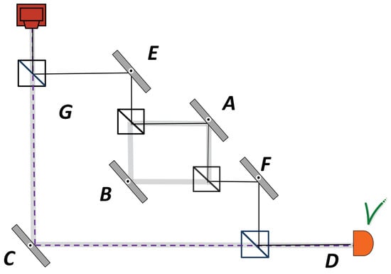 Nested Mach–Zehnder interferometer with inner interferometer tuned to destructive interference towards F. Although our ‘common sense’ suggests that the only possible path for the photon detected in D is path C, the trace was found also inside the inner interferometer supporting the TSVF proposal according to which the particle was present in the places where forward (red continuous line) and backward (green dashed line) evolving wavefunctions overlap. The latter is demonstrated by the results of the measurement by Danan et al. [].