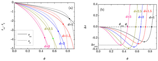 Figure 1a shows and as functions of the packing fraction for a few dimensions . In all cases, both functions become more negative as the packing fraction increases. Moreover, at a common packing fraction , both and decrease as the dimensionality increases. This is an expected property in the conventional case of integer d since, at a common , all the thermodynamic quantities depart more from their ideal-gas values with increasing d. Not surprisingly, this property is maintained in the case of non-integer d.