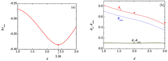 (a) Plot of as a function of d. The circle and the arrow indicate the location of the minimum at ; (b) Plot of (solid line), (dashed line), and the difference (dotted line) as functions of d. The horizontal solid line signals the value . The circles represent the values at and at corresponding to the fluid-hexatic [25,26] and fluid-crystal [27,28,29] transitions, respectively.