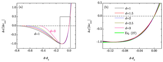 (a) Plot of the scaled RMPE as a function of the difference for dimensions , , 2, and 3; (b) Magnification of the framed region of (a). The light thick line represents the formula given by Equation (27).