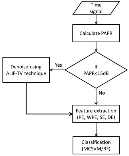 Relevant information is then extracted from the denoised or noise-free signals by means of Permutation Entropy (PE), Weighted Permutation Entropy (WPE), Sample Entropy (SE) and Dispersion Entropy (DE). The four entropies are embedded into a feature vector per signal instance, which is implemented in MCSVM and RF classifiers. The employed denoising, feature extraction and classification algorithms are explained in detail as follows.