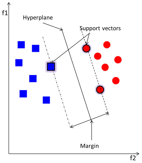 SVM is used in this work as a binary classifier that groups separately data from two classes only in the feature space by means of a hyperplane, whose distance from the nearest point of each class determines the margin [35]. Ideal SVM performance requires wide margin and thus an optimum separation between the classes. The basic SVM separates two classes using a linear kernel function as illustrated in in Figure 2. There exist other kernels, such as quadratic, polynomial and Radial Basis Function (RBF), to adapt the nature of data. Optimisation techniques are recommended to choose the best kernel function, along with its parameter, to employ for a high performance. Here, a grid search method [36] is employed as an optimisation technique. This involves multiple training and testing of the MCSVM with a grid of all possible kernel functions and their parameters.