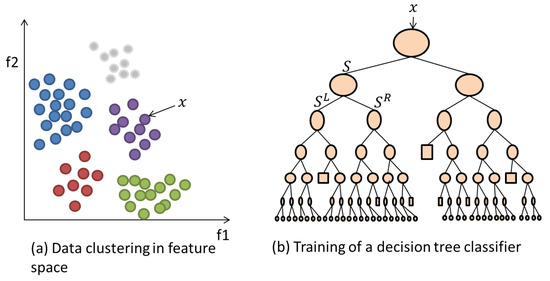 (a) Example feature space representation of data instances that belong to 5 different classes (colours). (b) An example decision tree classifier architecture.