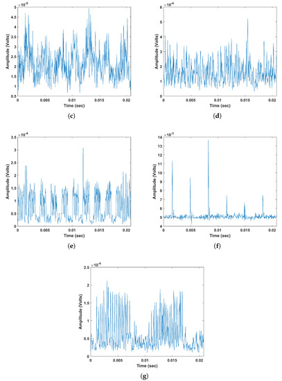 Time series signals of (a) Partial Discharge (PD) (b) Arcing (A) (c)Process Noise (PN) (d) Random Noise (RN) (e) Data Modulation (DM) (f) Exciter (E) (g) microSparking (mS).