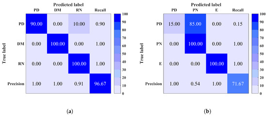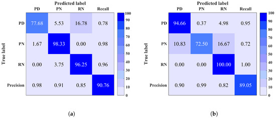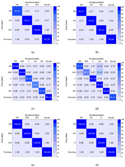 Site 7: The confusion matrix of this site, illustrated in Figure 7b, explains the low classification accuracy such that PD instances were predicted as PN. Again, this is a similar case to sites 1, 2 and 5, where noisy PD signals are confused with noise. Note that for each site it is observed that the precision and recall are directly proportional to the classification rate within each class.