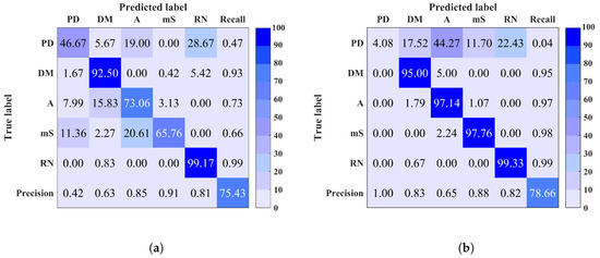 Confusion matrix of (a) site 5 (b) site 7 using Random Forest (RF). Overall classification accuracy is shown in bottom right corner.