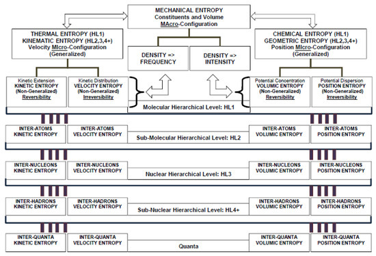 The definition in terms of density and frequency spans from classical and statistical thermodynamics is adopted to describe the origin of energy and entropy contributions due to kinetic energy and potential energy of a microscopic system up to the quantum mechanics domain for the Schrodinger equation is constituted by the Hamiltonian operator resulting from the sum of a kinetic operator and a potential operator of the wavefunction . This definition extends the hierarchical levels to the scale of atomic, nuclear and sub-nuclear systems where quantum mechanics provides the equations describing the motion of particles [7]. However, the ultimate origin of Second Law is rationalized in the conceptual paradigm of quantum thermodynamic that governs equilibrium and non-equilibrium processes at fundamental microscopic level. The irreversibility is inherent due to quantum states being “characterized by irreducible intrinsic probabilities” [8,9,10,11], and the physical entropy is an intrinsic and non-statistical property of matter. Steepest-entropy-ascent of microscopic dynamics is contextualized in quantum thermodynamics.
