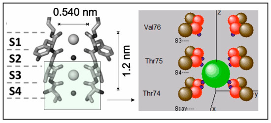 Selective translocation of ions bound to charges across the plasma membrane of cells provides the physical background for the generation and propagation of electrical membrane signals in excitable cells, particularly in nerve cells. The molecules organizing this translocation are provided by membrane-integrated channel proteins, which control the access of ions to permeation (“gating”) in response to changes in transmembrane potentials (“voltage-gating”) and allow very fast ion conduction without loss of selectivity towards certain ion species [1,2]. An unprecedented series of studies of these proteins has been initiated after the elucidation of the atomic resolution crystal structure of the prototypic S. lividans K+ channel by MacKinnon et al. [3]. It turned out that the critical domain of the protein that can combine fast transduction close to the diffusion limit with selective preference for the intrinsic ion species is provided by the narrow selectivity filter (SF) of the protein [4]. In particular, an evolutionary highly conserved sequence of amino acids, the TVGYG (Thr75, Val76, Gly77, Tyr78, Gly79) motive lining the filter region, allows for an inward orientation of backbone carbonyls with oxygen-bound lone pair electrons interacting with the positively charged alkali ions (see Figure 1). This delicate arrangement involving glycine (Gly79, Gly77) residues serving as “surrogate D-amino acids” [5] can offer a unique “interaction topology”, mimicking the ions’ hydration shells prior to entering the filter pore. The interactions are realized by short-range attractive (filter atoms) and repulsive (between ion) Coulombic forces [2,6].