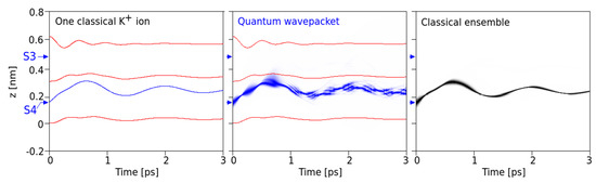 First, our intention focused on the comparison between the classical standard MD setting and the quantum mechanical version under the same interaction potentials between all constituents and the same initial position and velocity distribution of the ion (Figure 2). This yielded comparable results under situations where the K+ ion is coordinated at a specific site (e.g., S4) and oscillates within this site due to its thermal energy. In the QM version, the wave packet is placed at the minimum of the potential of this site (at z = 0.15 nm) and assigned a mean velocity corresponding to a kinetic energy sufficiently below the potential barrier to the next site. For the examples shown, we have chosen v0 = 300 m/s. As can be seen from Figure 2, under identical initial conditions at time t = 0, the temporal behavior of a single classical ion (left) is similar to the behavior of the QM wave packet, with the same frequency (around 900 GHz) and amplitudes. This similarity becomes even more striking in a comparison of the single wave packet with a classical ensemble of ions computed for 104 particles under an identical initial position and velocity distribution as in the QM version (Figure 2, right).