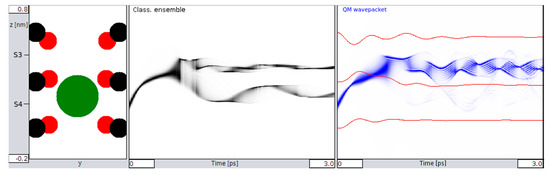 First, our results provide a comparison between classical and QM implementations, which reveal a high degree of similarity in the overall, time-dependent behavior during a several pico-second time interval (Figure 2). The observed similarity is particularly obvious for the ensemble behavior of ions and certainly signals a high level of consistency of the implemented methods. Besides this similarity at the “caged” state, as shown in Figure 2, we also observe small but significant differences in the time evolution of QM and classical ions prior to transitions from S4 to S3 that bear the “seeds” for subsequent QM classical dissociations during the passage from one binding site to the next site. Following this initial situation, the site transition favored by higher onset velocities marks a clear difference between the behavior of the QM wave packet and the classical ensemble of ions. At a critical velocity of ions, the classical probability splits into ½ of its population, with 50% crossings to S3 and the rest remaining in S4 (Figure 3 and Figure 4). Within the same time, and under the same initial conditions, the QM packet, however, can cross to S3 almost completely. An increase in efficiency to cross the barriers of about 50% could be expected to increase permeation rates at larger scales by a similar amount (i.e., within a complete filter occupancy and including intermittent water molecules in the filter domain). Compared with previous reports about the discrepancy of calculated energetic barrier heights from PMF methods (between 5 and 10 kcal/mol) with observed and “effective permeation heights” as required by Nernst–Planck estimates of <~3 kcal/mol at 300 K [11], the ratio of this difference lays well within the range of permeation enhancement as predicted here. In other words, assigning a short (1 ps) coherent quantum mechanical property to the atoms motion interacting with the carbonyl derived forcefields can explain fast conduction speeds, whereas purely classical models cannot.