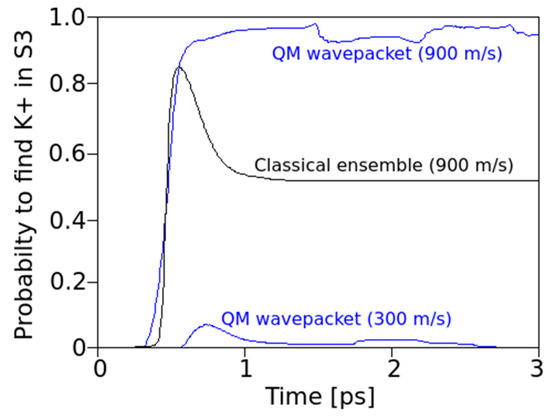 Time-dependent probabilities to find an ion in S3, when the ion was implanted into S4 with different mean onset velocities (900 m/s blue top for the QM wave packet, black for the classical ensemble) and at 300 m/s for the QM wave packet (with some probability <0.1 to cross over to S4). At this initial velocity of 300 m/s, the classical particles do not cross to S3. Note: most classical particles with 900 m/s are in S3 after 0.5 ps but eventually about 45% return to S4 due to oxygen charge derived forces (the spring that returns these ions to equilibrium positions with vibrations around 3 THz, see Figure 2). The QM wave exhibits a small but remaining probability (<10%) of returning to S4.