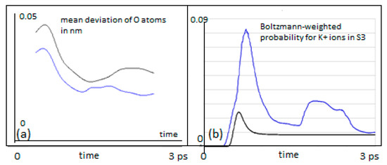 (a) Mean deviation of Tyr75 carbonyl oxygens from their equilibrium positions, while a K+ is moving past from location S4 to S3 (in nm). The classical particles are in black, QM wave packets in blue; (b) Probability for a K+ ion to be found in S3, setting out from S4 with mean velocities between 100 m/s and 900 m/s, weighted according a Boltzmann velocity distribution at 310 K (blue QM, black classical).