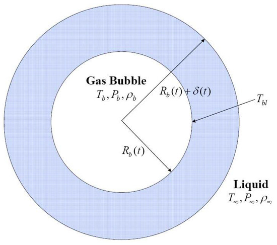 A schematic of a bubble model is given in Figure 1, which shows a spherical gas or vapor bubble in liquid at an ambient temperature T∞ and pressure P∞. Heat transfer is assumed to occur through the thermal boundary layer of thickness δ(t). The driving force for the bubble evolution is either an initially imposed high pressure inside the bubble or an external force applied to the bubble. Assume that the spherical shape is maintained during bubble evolution.