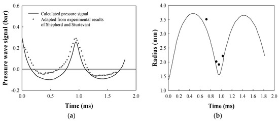(a) The far-field pressure signal from the oscillating butane bubble in ethylene glycol; (b) The radius–time curve for a bubble evolved from a butane droplet at its superheat limit in ethylene glycol.