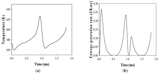 (a) The time rate change of the temperature for the vapor inside the butane bubble; (b) The entropy generation rate for the butane bubble shown in Figure 2.