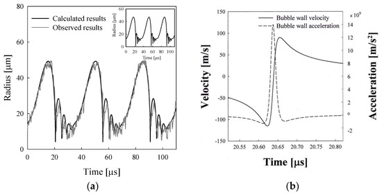 The bubble behavior model discussed in Section 3.1 and Section 3.2 adequately describes a sonoluminescing bubble in sulfuric acid solutions, which reveals various nonlinear phenomena. The calculated radius–time curve for an argon bubble with an equilibrium radius Ro of 13 μm driven by the ultrasound with a frequency of 28.5 kHz and amplitude of 1.4 atm in an aqueous solution of sulfuric acid is shown in Figure 4a, which shows close agreement between the calculation results and observed ones. The thermodynamic properties for an 85% sulfuric acid solution are ρ = 1800 kg/m3, Cs = 1470 m/s, μ = 0.025 Ns/m2, σ = 0.055 N/m, kl = 0.4 W/mK, and Cp,l = 1817 J/kgK. The sound speed in an 85% sulfuric acid solution is comparable to the sound speed in water. In fact, the sound speed is one of the decisive properties for the occurrence of the sonoluminescence [27].