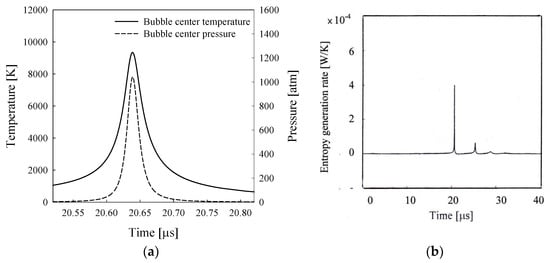 Figure 5a shows the calculated time-dependent temperatures and pressures at the center of the bubble shown in Figure 4a. The calculated peak temperature at the collapse point, which is about 9300 K, is close to the observed value of 10,000 K [28]. Additionally, the calculated peak pressure value of 1020 atm is close to the observed value of 1090 atm. The estimated peak temperature and pressure at the collapse point are approximately 25,000 K and 10,000 atm, respectively, for the sonoluminescing air bubble in water [21]. The approximation of ‘uniform pressure’ turns out to be good for the sonoluminescing bubble in sulfuric acid solution because the bubble wall acceleration at the collapse point is much smaller than that of the sonoluminescing gas bubble in water. Figure 5b shows the entropy generation rate, which shows a sharp peak at the first collapse and a subsequent smaller peak during the rebounding motion. This figure indicates that heat transfer occurs notably around the first collapse phase.