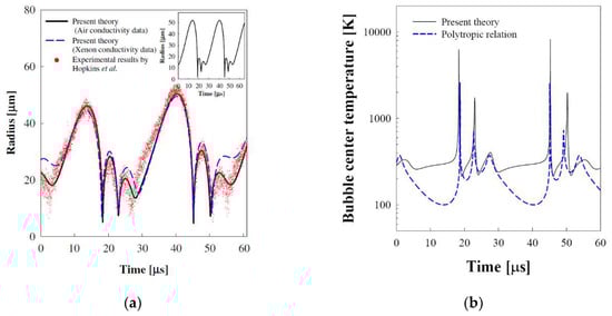 Slight changes in the equilibrium radius of the bubble and driving amplitude and the frequency of the applied ultrasound induce a drastic change for the bubble motion in a sulfuric acid solution. The calculated radius–time curve along with the observed results for a xenon bubble with Ro = 15 mm, driven by the ultrasonic field with a frequency 37.8 kHz and amplitude of 1.5 atm in an 85% sulfuric acid solution is shown in Figure 6a. With air thermal conductivity (solid line), the calculated radius–time curve which exactly mimics the alternating pattern of the observed result shows two states of bubble motion, a light emission cycle after no light emission cycle. With xenon thermal conductivity (dashed line), however, a slightly different pattern for the bubble motion was obtained. The time-dependent temperature at the bubble center, as shown in Figure 6b, indicates also the two states of bubble motion. The Rayleigh–Plesset equation with polytropic relation, a conventional method used to predict the sonoluminescence phenomena [31,32], cannot predict the two states of bubble motion as shown in the inset in Figure 6a.