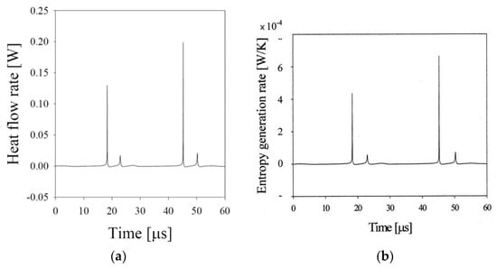 These calculated results imply that the bubble behavior an consequently the sonoluminescence phenomena depends crucially on the heat transfer experienced by the bubble as shown in Figure 7a. At the sonoluminescing phase, the heat flow rate is 0.20 W at the collapse point. On the other hand, the heat flow rate is approximately 0.14 W at the collapse point for the non-lighting phase. The entropy generation rate is similar to the pattern of the heat flow rate as shown in Figure 7b. The alternating pattern for the bubble motion may happen due to the entropy generation by the heat transfer through the bubble wall [24], which produces lost work: less entropy generation in one cycle having a lower maximum bubble radius and, consequent, a lower minimum bubble radius at the collapse provides more expansion work for the bubble’s next cycle, while a larger amplitude motion experiencing more entropy generation provides less expansion work to the subsequent motion. The calculated minimum bubble radius for the light-emitting cycles, 4.6 μm, is close to the observed value of 3.7 μm [3].