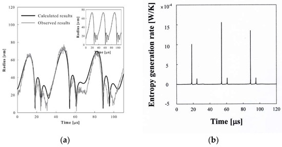 Figure 8a shows the bubble radius–time curve for an argon bubble of Ro = 17μm driven with an ultrasound amplitude of 1.7 atm and a frequency of 28.5 kHz [33], which mimics the observed one remarkably [3]. This is a case in which the bubble emits light for two consecutive cycles after a no-emission cycle. The calculation result with a polytropic relation shows the same pattern of bubble behavior every cycle as shown in the inset of Figure 8a. The entropy generation rate due to the heat transfer through the wall for the bubble shown in Figure 8a, which can be obtained from Equation (18), is given in Figure 8b. Less entropy generation in one cycle provides more expansion work for the bubble’s next cycle. Such an alternative motion is possible because the same ultrasound amplitude is applied each cycle.