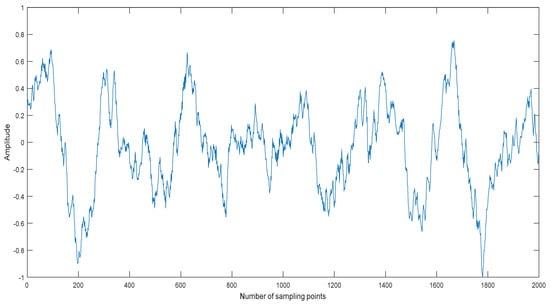 Usually the MIs between noise IMFs are different from ones between non-noise IMFs. We take a ship signal as an example. The normalized ship signal is shown as shown in Figure 2, the sampling frequency and the number of sampling points are 44.1 kHz and 2000, respectively. The decomposition result of the ship signal by CEEMDAN is shown in Figure 3. The center frequency distribution of IMFs and the MIs of two neighboring IMFs are shown in Table 1 and Table 2, where MIi represents the MI of IMFi and IMFi+1. As shown in Table 1 and Table 2, the center frequency decreases with the increase of IMF, the first three MI of IMFs are obviously less than the other ones of IMFs. According to the prior information of ship signal, its main frequency range is less than 5000Hz, the first three IMFs are noise IMFs, which is consistent with the judgment of MI. Therefore, we can use MI to identify noise IMFs in this paper, when the MI of IMFi and IMFi+1 increases, obviously more than the former MIs, the former i − 1 IMFs are considered as noise IMFs.