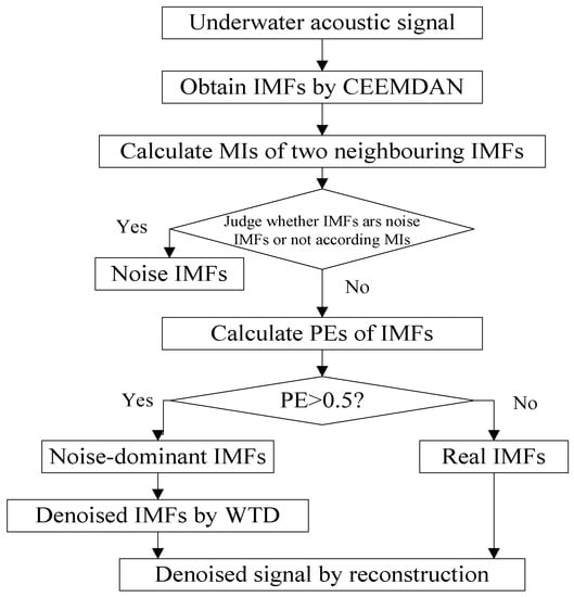 In recent years, many denoising methods based on EMD and its improved algorithms have been proposed [19,20]. In a previous paper [21], a denoising algorithm for gear signals is proposed based on CEEMDAN, PE and peak filtering, the IMF spectra are obtained by CEEMDAN, and the PEs of IMFs are calculated to identify whether the IMFs require denoising by peak filtering, the filtered and the others IMFs are reconstructed finally. In a previous paper [22], a ECG signal denoising algorithm is put forward using CEEMDAN and wavelet threshold denoising. In addition, denoising algorithms for the impact signal and friction signal are proposed using CEEMDAN combined with fuzzy entropy and MI in past papers [23,24]. However, there has been no previous studies on underwater acoustic signal denoising based on CEEMDAN as far as we know [25,26]. Moreover, among the existing denoising algorithms, IMFs are usually divided into two parts: noise IMFs and real IMFs, and there are some limitations in this division.