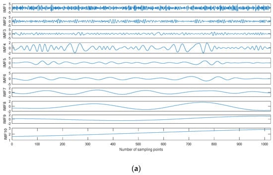 EMD and its improved algorithms are suitable for analyzing nonlinear, non-stationary, and non-Gaussian signals. Furthermore, EMD and its improved algorithms are self-adaptive and based on characteristic time scale of the data itself. However, EMD has the phenomena of mode mixing due to intermittency, which hinders the development and application of EMD [5]. In order to reduce its influence, many improved algorithms are presented such as EEMD, complementary EEMD (CEEMD), and complete EEMD with adaptive noise (CEEMDAN) [6,7,8]. The proposed method follows a study of the statistical characteristics of white noise, involves a noise-assisted analysis, and adds white noise of a uniform frequency distribution into EMD to avoid mode mixing. EEMD is a noise-assisted analysis algorithm to avoid mode mixing by adding white noise. However, this improved algorithm raises two new problems, one is the difference in IMF numbers and the other is the introduction of extra noise. CEEMD can avoid adding extra noise using positive and negative white noises, however, it still cannot make the number of IMF consistent by each decomposition. CEEMDAN can solve this problem because it only decomposes the first IMF for each decomposition; it has better decomposition effect and lower computational cost than EEMD and CEEMD.