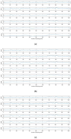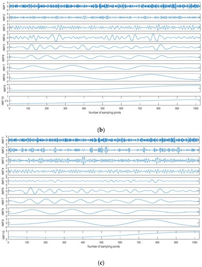 The six kinds of reconstructed signals by different decomposition methods. (a) EMD, (b) EEMD, and (c) CEEMDAN.