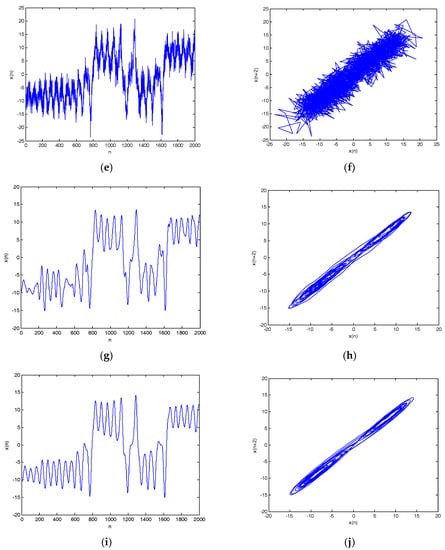 Denoising results of different SNR by CEEMDAN-MI-PE are shown in Table 8. As shown in Table 8, the SNR and RMSE are improved evidently, the proposed denoising method enhances the SNR more than 10 dB. Overall, the above results show that the CEEMDAN-MI-PE method is suitable for chaotic signals.