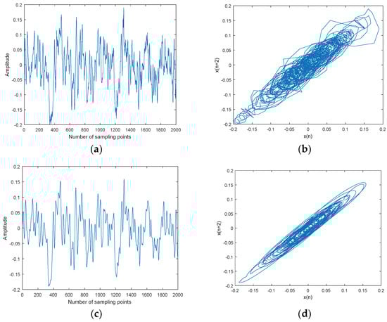 Ship-2 and denoised Ship-2 signals and their attractor trajectories. (a) Ship-2, (b) attractor trajectory for ship-2, (c) denoised Ship-2, (d) attractor trajectory for denoised ship-2.