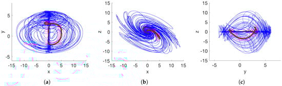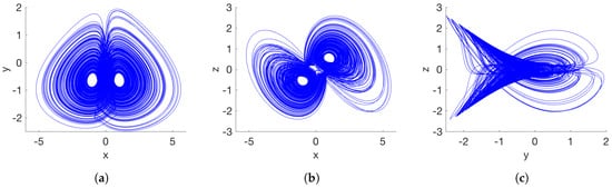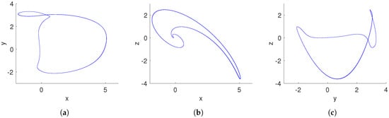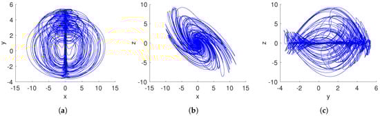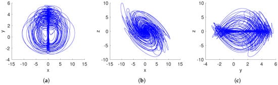 Hidden attractor of the system (15) considering , , and initial conditions . (a) x–y plane; (b) x–z plane; (c) y–z plane.