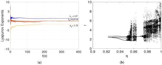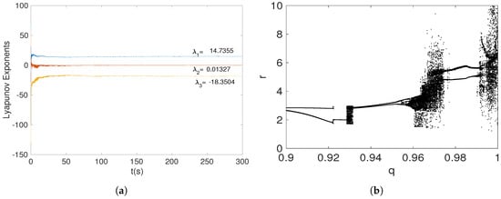 Figure 3a shows the Lyapunov exponents spectrum when the fractional-order system (15) is nonhyperbolic. The positive Lyapunov exponent indicates a chaotic behavior. Additionally, the dynamical behavior of the system (15) can also be illustrated by the bifurcation diagram in Figure 3b. Due to system (15) having only one parameter, which must be to present nonhyperbolic equilibrium points, it is interesting to analyze its dynamical behavior when a is fixed and the fractional-order q is varied. The bifurcation diagram in Figure 3b demonstrates a period-doubling route to chaos.