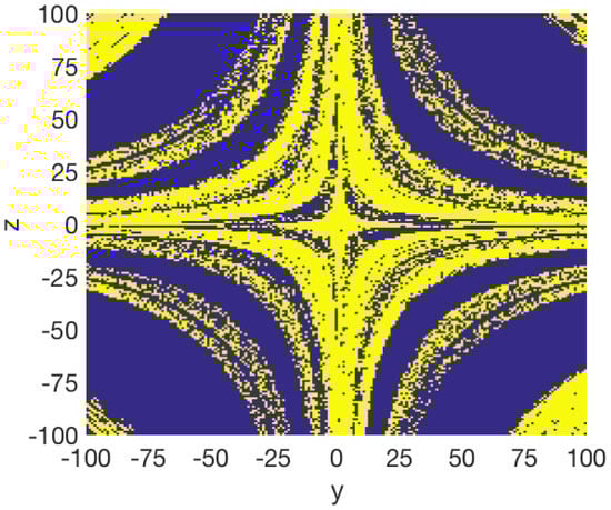 Cross-section of the basins of attraction of the two coexisting attractors in the y–z plane at for the fractional-order chaotic system without equilibrium (15) when and .