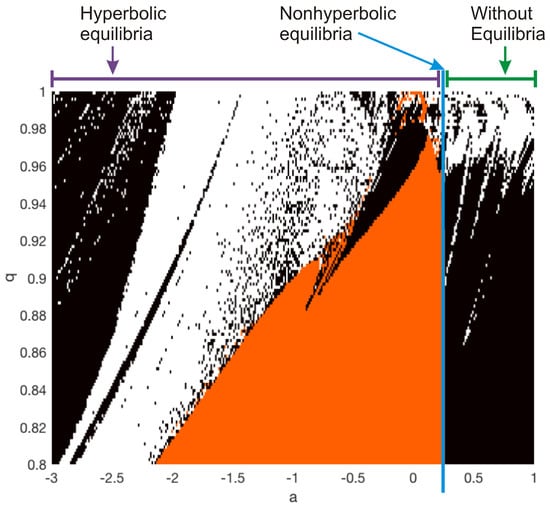 This map indicates the type of equilibrium and the resulting dynamical behavior for a given a and q. The white, black, and orange regions evolve in chaotic, periodic, and unbounded behavior, respectively. From Figure 9, the minimal fractional order can be also determined. For instance, when , we observe that the chaotic attractor can appear for , as was demonstrated in Section 3.1. However, unbounded trajectories are obtained if , but a chaotic behavior can be detected for fractional orders as low as when . Similarly, the chaotic attractor from nonhyperbolic equilibria is found for . For the case of a no-equilibria system (), we observed that the minimal fractional order wherein hidden chaotic attractors can emerge is about . For lower orders, the system only generates hidden periodic attractors.