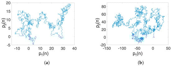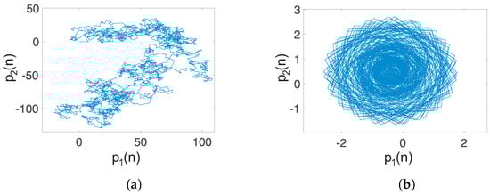 Case 3: Coexistence of hidden attractors: When , , and initial conditions , we localize a hidden chaotic attractor, as shown in Figure 7. By applying the “0–1 test”, . Besides, the translation components , shown in Figure 11a, behave as Brownian-like motion. When the initial conditions are chosen as , and the parameters maintain the same value, the translation components are now bounded, as shown in Figure 11b. Besides, the asymptotic growth rate is . Therefore, the hidden attractor is periodic.