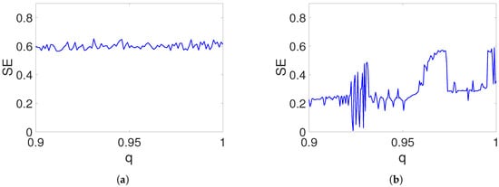 The structural complexity of the self-excited and hidden attractors generated by the fractional-order system (15) is analyzed by Equation (22). The SE is computed from the time series of the system (15) with length . Figure 12a shows the SE for the case of the self-excited attractor, whereas Figure 12b displays the SE of the hidden attractor. The complexity of the self-excited attractor is almost constant in the interval . On the other hand, the SE of the hidden attractor, as a function of fractional order, presents regions where the complexity is close to , but other regions have a low SE. Therefore, we must be aware of the selected fractional order in the hidden attractor in order to have a relatively high structural complexity.