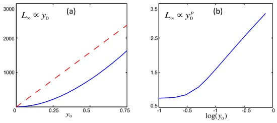 In contrast, for the cubic process, the relation is not linear, and the log-log plot on the right in Figure 2 shows a power-law dependence with the power-law index p. This power-law index p varies between 1.52 and 1.91 and depends on the width () of initial PDF and stochastic forcing amplitude D, as shown in [16]. This indicates that nonlinear force breaks the linear scaling of geometric structure and changes it to power-law scalings. In either cases here, has a smooth variation with with its minimum value at since the equilibrium point 0 is stable. This will be compared with the behaviour in chaotic systems in Section 3.2.