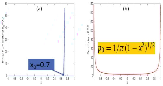 (a): an initial narrow PDF at the peak ; (b): the invariant density of a logistic map.
