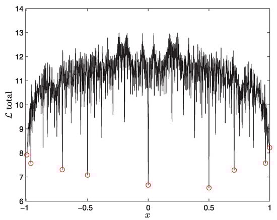 As we are interested in a chaotic attractor, we chose the value so that any initial value evolves to a chaotic attractor given by an invariant density (shown in the right panel of Figure 3). A key question is then whether all values of are similar as they all evolve to the same invariant density in the long time limit. To address how close a particular point is to equilibrium, we (i) consider a narrow initial PDF around at , (ii) evolve it until it reaches the equilibrium distribution, (iii) measure the between initial and final PDF, and (iv) repeat steps (i)–(iii) for many different values . For example, for , the initial PDF is shown on the left and final PDF on the right in Figure 3. We show against in Figure 4. A striking feature of Figure 4 is an abrupt change in for a small change in . This means that the distance between and the final chaotic attractor depends sensitively on . This sensitive dependence of on means that a small change in the initial condition causes a large difference in a path that a system evolves through and thus . This is a good illustration of a chaotic equilibrium and is quite similar to the sensitive dependence of the Lyapunov exponent on the initial condition [25]. That is, our provides a new methodology to test chaos. Another interesting feature of Figure 4 are several points with small values of , shown by red circles. In particular, has the smallest value of , indicating that the unstable point is closest to the chaotic attractor. That is, an unstable point is most similar to the chaotic attractor and thus minimises .