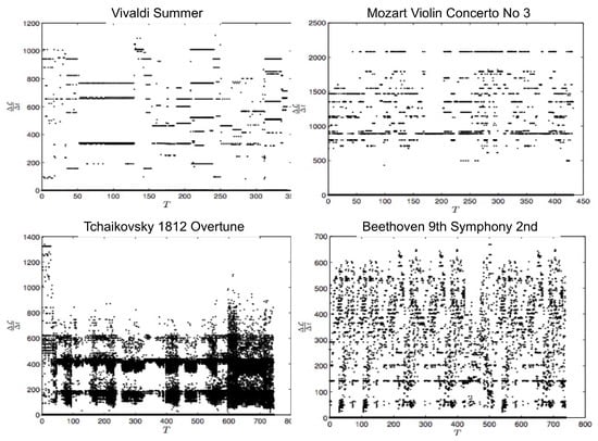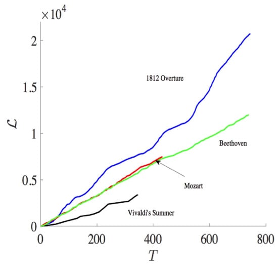 Specifically, the midi file stores a music by the MIDI number according to 12 different music notes (C, C, D, D, E, F, F, G, G, A, A, B) and 11 different octaves, with the typical time between the two adjacent notes of order s. In order to construct a PDF, we specify 129 statistically different states according to the MIDI number and one extra rest state (see Table 1 in [14]) and calculate an instantaneous PDF (see Figure S1 in [14]) from an orchestra music by measuring the frequency (the total number of times) that a particular state is played by all instruments at a given time. Thus, the time-dependent PDFs are defined in discrete time steps with , and the discrete version of (Equation (7) in [14]) is used in numerical computation. Figure 5 shows against time for Vivaldi’s Summer, Mozart, Tchaikovsky’s 1812 Overture, and Beethoven’s Ninth Symphony 2nd movement. We observe the difference among different composers, in particular, more classical, more subtle in information change. We then look at the rate of information change against time for different music by calculating the gradient of () in Figure 6, which also manifests the most subtle change in information length for Vivaldi and Mozart.