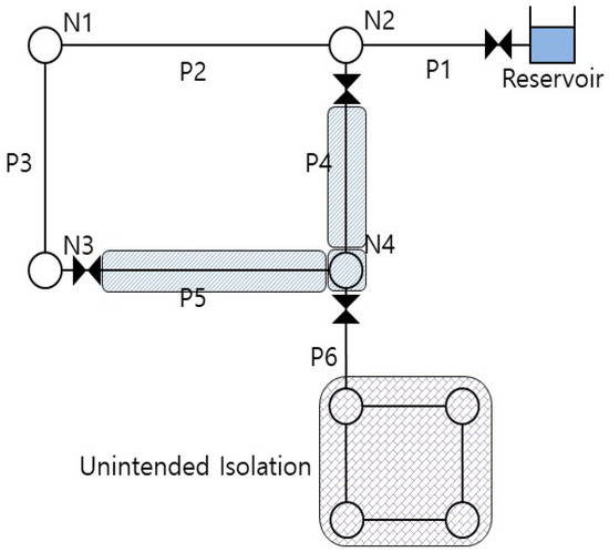 Jun [47] defined unintended isolation (UI) as an isolated area to which the sole passage to the source is unintentionally cut off due to pipe or segment blockage. Although no direct failure occurs in this area, water supply is indirectly shut off due to the failure of another zone. An UI can consist of a single node or a combination of a single node and one or more pipes. As shown in Figure 2, the segment shuts off the lower area connected by P6 from the source, thereby generating an UI.