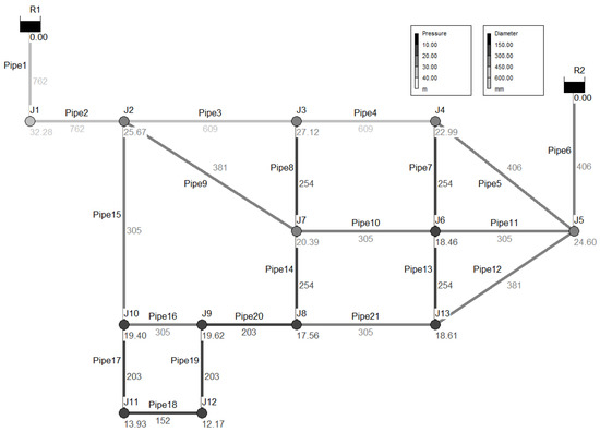 In a normal state, Ozger’s network had a total supply of 3146.4 Cubic Meters per Hour (CMH). Figure 3 shows the pressure distribution of each node under the normal state. For the HOR equation parameters, the minimum pressure head was set to 0 m and the desirable pressure head was set to 15 m, which approximated the minimum reference pressure head (15.3 m) of the Water Supply Facility Criteria [51]. If the minimum reference pressure head was used as the criterion, nodes J11 and J12 did not satisfy the water supply serviceability for consumers, even in a normal state. Pipe failure scenarios assumed that water valves were installed at both ends of the pipes. The failure of 21 total segments was then considered in the hydraulic analysis.