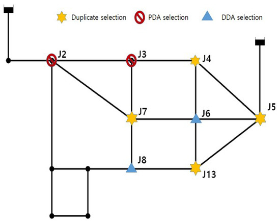 DDA was also conducted and the results were compared with those of the proposed method. Table 6 presents total entropy values of each node in descending order, for production by both PDA and DDA. J4 and J3 had the largest total entropy for PDA, while DDA assigned the largest value to J7 and J13. Although the absolute values of total entropy at each node cannot be compared between PDA and DDA, the difference can be analyzed based on the spatial arrangements of nodes. Figure 4 displays the top six nodes of each hydraulic analysis method; the stars indicate nodes selected by both methods. Of course, the spatial distribution may depend on the number of installation points. However, the DDA-based entropy method selected adjacent points for installing pressure gauges, thereby exhibiting a skewed distribution. In contrast, the PDA-based entropy method selected not only J2, which is adjacent to the upper left source (R1), but also J5, which is near the upper right source (R2). In addition, it exhibited an overall equal distribution of installation points. Generally, when a pipe adjacent to a source in a WDN system has a hydraulic change, the entire system is affected. In this regard, J2 and J5 could be important nodes in terms of connectivity within the relatively simple Ozger’s network, even if no hydraulic result is considered. However, the DDA-based entropy method showed that J2 had the lowest total entropy among all nodes. Accordingly, this method turned out to have low reliability.