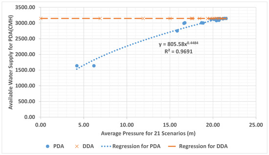 Graph of the average nodal pressure and available water supply based on 21 pipe failure scenarios.