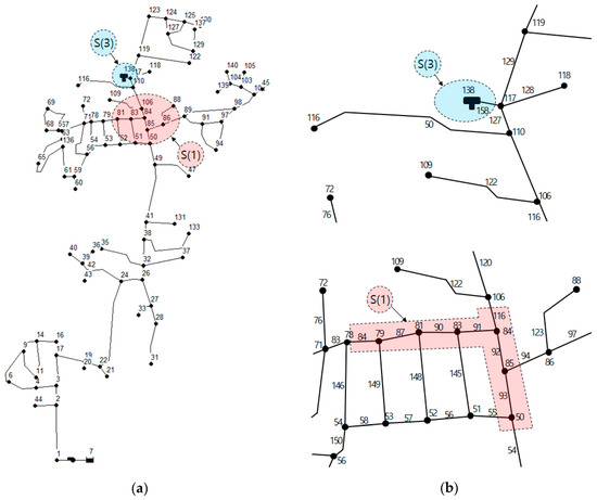 The target network is the Cherry Hills WDN in Connecticut, U.S. As shown in Figure 7a, this network consists of 88 nodes, 104 pipes, and 1 tank. The pipe diameters are 6, 8 and 12 inches, respectively, and the pipes are connected in a branched network. The actual locations of water valves were considered to conduct a segment-based analysis. The water valve locations and corresponding segment results were based on the study by Yoo et al. [53]. This network is composed of 80 total subsystems (Segment + UI), and each segment mostly consists of 1–3 pipes with a maximum 7 nodes. Accordingly, the network is divided into small groups; however, the Cherry Hills WDN has many UIs, one of which includes approximately 30 nodes and 40 pipes. If UI occurs, all the demands of the nodes included in the UI are blocked. Accordingly, the effects on the corresponding subsystem would be large. Figure 7b shows the locations and ranges of major segments S(1) and S(3). Among 80 total segments, 10 segments were very affected by water cut-off (Subsystem Important Index, [53]) and were selected as pipe failure scenarios. The Subsystem Importance Index (SII) can quantify the effect of isolating a subsystem on the entire network. The SII is introduced with a range of 0 to 1. A large SII value indicates that the water supply and pressure of an entire water distribution system are decreased severely by the isolation of the corresponding subsystem including the segment and the UI. In case of Cherry Hills Network, we selected the largest 10 subsystems as representative failure scenarios, which have the SII value is over than 0.05.