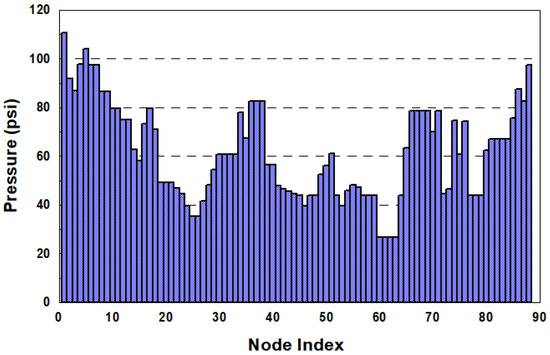 Figure 8 display the pressures of each node under the normal condition of the Cherry Hills Network. The nodal pressures range from 26 psi (18.3 m) to 110 psi (77.3 m), exhibiting a diverse distribution, and the criterion for the minimum pressure head (15.3 m) was satisfied. The desirable pressure head (m) was set to 25 psi (17.6 m), which approximated the lowest pressure within the network.