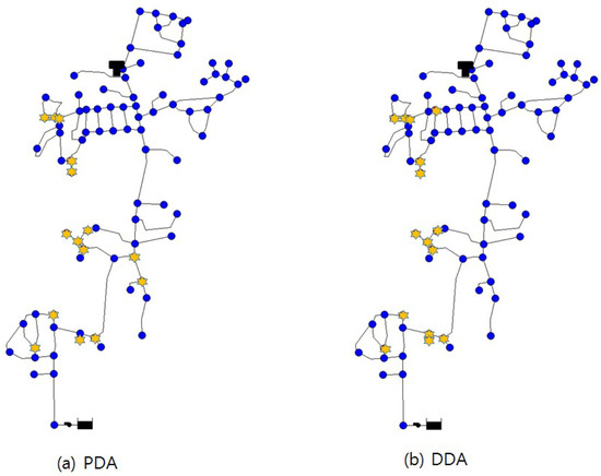 Figure 9 illustrates the results of optimal pressure gauge locations produced by PDA and DDA-based entropy methods, respectively. Among 80 total nodes, 15 nodes were given priority and are marked by stars. As in the Ozger’s network results (Section 3.1), DDA selected adjacent nodes as the installation points and shows a left-skewed distribution within the entire system. Although there were some duplicate nodes between PDA and DDA, PDA showed that pressure gauges should be installed at nodes of the main transmission line, which connects the resources to a tank or end consumers. Accordingly, to derive a final priority order, the PDA-based entropy method considered not only major nodes, but also reasonably reflected the mutual effects among nodes, based on the connectivity of the real network and the hydraulic results.