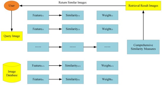 The main process of common system framework for image retrieval based on fusion of multiple features at the metric level is as follows [,,,,]. Firstly, we extract several features of image and build benchmark image database. Then, when users enter images, we calculate the similarity between the query image and images of the database based on several features, separately. Finally, we get the comprehensive similarity measure by weighting several similarities and output retrieval results based on it.