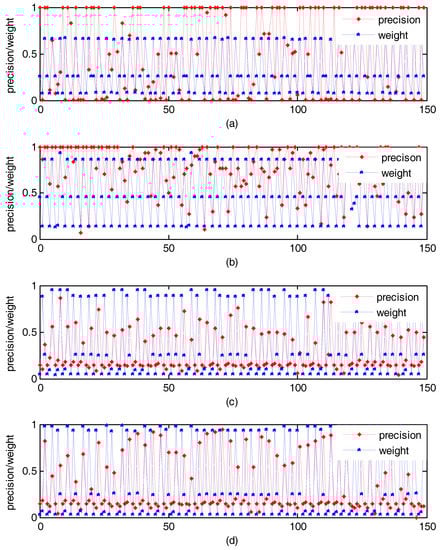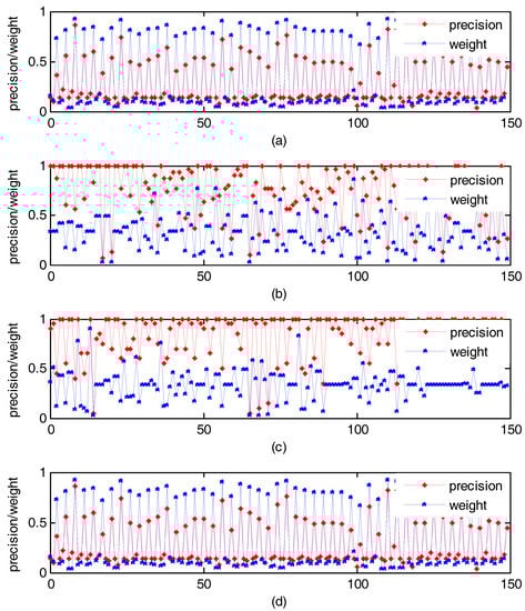 Under supervised condition, the change of weight that obtained by our method with precision. (a) Experiment result on Holidays; (b) Experiment result on Wang; (c) Experiment result on UC Merced Land Use; (d) Experiment result on RSSCN7.